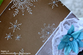 I used kraft card stock from Kraft Outlet as the base of my card. I then stamped snowflakes in white. I heat embossed them and added bling for more interest.